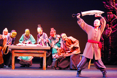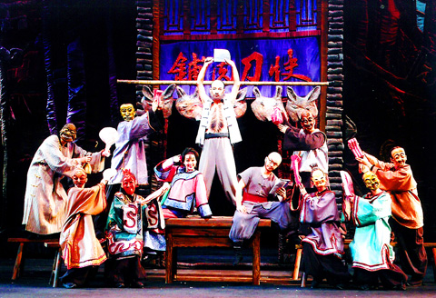 The play’s comic flavor is enhanced by Huang Hai-wei’s (黃海威) hand-carved wooden masks, which are inspired by the nuo (儺) masks of Sichuan Opera and Italian commmedia. With the exception of the scholar, executioner and his wife, all characters on the stage wear masks — another interesting reversal because in traditional Chinese theater only the lead characters on stage would wear masks.