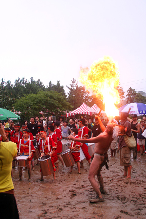 In the late afternoon, the Dream Community Samba Drummers, a group of elementary school kids from a nearby Aboriginal village, gave a spirited performance. They paraded through the mud in front of the stage dressed in traditional garb with Gordon Tsai (蔡聰明) of the Dream Community (夢想社區), an artists’ village in Syijhih (汐止), who led the procession while performing fire-breathing tricks. The kids charmed the festivalgoers, many of whom clapped along and snapped photos.
