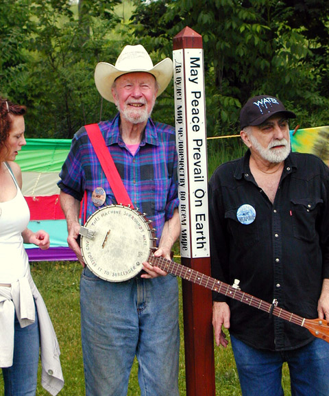 Pete Seeger pulled his black Toyota Highlander into the Staples parking lot here and plucked some signs from the back seat, including one with “Peace” spray-painted in large orange letters. With that, he slung his banjo over his shoulder like an old musket and marched toward the intersection of Routes 9, a bustling six-lane thoroughfare, and 9D, the “Hudson Valley POW-MIA Memorial Highway.”