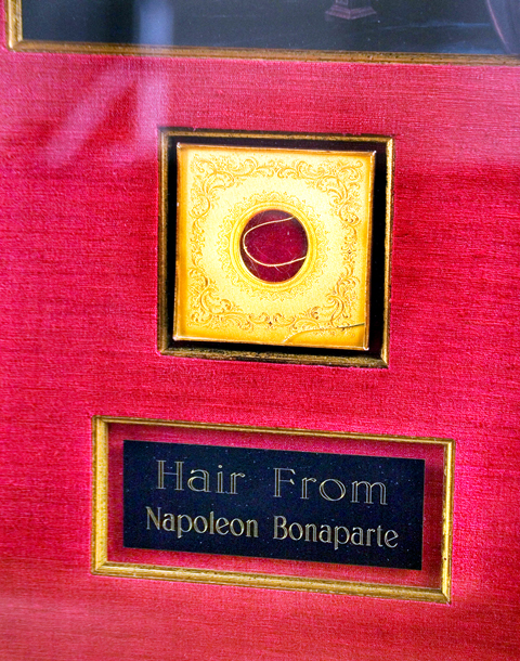 There’s the framed photo of Elvis, after getting his famous GI haircut, accompanying a hunk of his hair glued onto blue suede. Another frame on the wall holds the portrait of Charles I (before he lost his head), juxtaposed with a few strands of hair taken from his tomb (after he was beheaded).