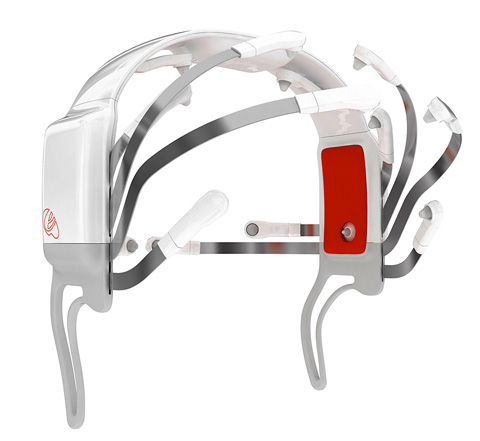 The EPOC headset features 16 sensors that press against a user’s scalp to measure electrical activity in a brain using electroencephalography. A built-in gyro tracks head movement.