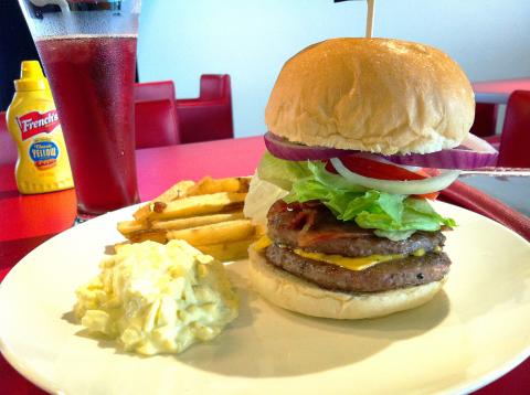 The menu selection consists of a dozen variations on America’s favorite sandwich, such as the Jumbo Chuck Burger (NT$380) and the Chicken and Beef Burger (NT$350), which comes with two patties, one chicken, one beef. Then there’s the Miss Wendy Burger (NT$220), which is supposed to be a recreation of a burger from Wendy’s, the US fast food chain that shut its operations from Taiwan in 1999.