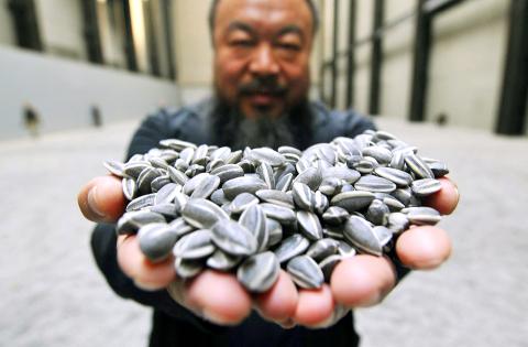 There is more to Chinese artist Ai Weiwei’s (艾未未) installation than meets the eye, however. Bend and pick up one of the “pebbles” and you can see that it resembles a sunflower seed encased in its striped husk. In fact, each one — and there are 100 million of them, covering an area of 1,000m2 — is handmade from porcelain and has been individually painted by hand.