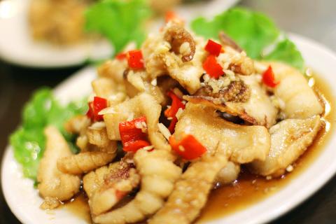 Another one of Chiachia’s best sellers is its vinegar-flavored cuttlefish (醋溜中卷, NT$260). Slices of cuttlefish are very lightly battered, fried and served drizzled in a sweet-and-sour sauce and covered with chopped chili peppers. The sweetness of the sauce balanced well with the vinegar and the cuttlefish was firm without being chewy.