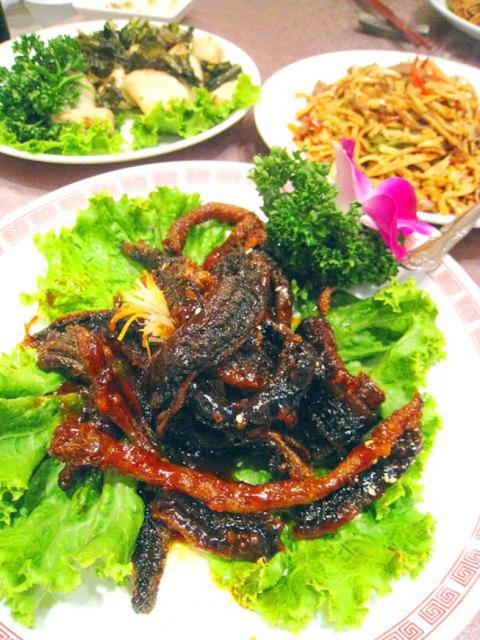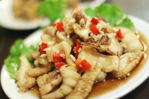 Du Hsiaw Uyea is famous for a number of Yilan specialties, but the lack of a menu or clearly marked price list can be intimidating for anyone unfamiliar with the cuisine. It is usually best to order a set menu, which starts at NT$600 for a table of two, or NT$3,500 and up for a table of 10. The steamed shrimp, which contains at least a whole head of garlic and copious quantities of rice wine, is to be recommended. The shockingly black chicken in xian cao (仙草), or grass jelly, might look a little like a chicken stuck in an oil slick, but it has subtle herbal flavors that make it highly memorable. A passion for ornate and often inappropriate plastic plate decorations makes the presentation appear kitsch for some dishes, but this in no way undermines the mixture of innovation and the firm grasp of the many, often labor-intensive, processes involved in the preparation of famous Yilan specialties.