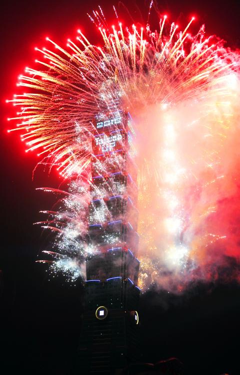 When the clock strikes midnight, Taipei 101 will welcome in 2011 with 30,000 rounds of fireworks for a 288-second show costing a total of NT$60 million (US$2 million) — double last year’s budget. Designed by none other than Cai Guo-qiang (蔡國強), a New York-based Chinese artist who employs both of President Ma Ying-jeou’s (馬英九) daughters, the explosive extravaganza will feature auspicious patterns to celebrate the 100th anniversary of the Republic of China’s founding.