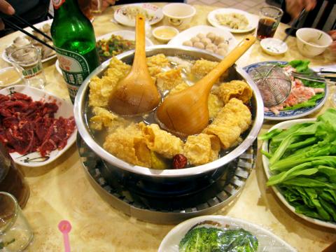 Shangching Sheep Hot Pot Restaurant (尚青ㄟ羊肉爐), located in the depths of Sanchong (三重), likes to flaunt a hard-core image. It’s tactic, which involves hanging whole sheep carcasses outside the main entrance next to a slab so that diners can view the butchering of the raw meat, has certainly generated a hearty response. Some are disgusted by the spectacle, and have expatiated at length on various food blogs, even going so far as to draw a parallel with the public slaughter and the skinning of snakes that was once a popular attraction at the Huaxi Street (華西街) night market. There are others, myself included, who are attracted by the offer of fresh mutton that these carcasses promise.