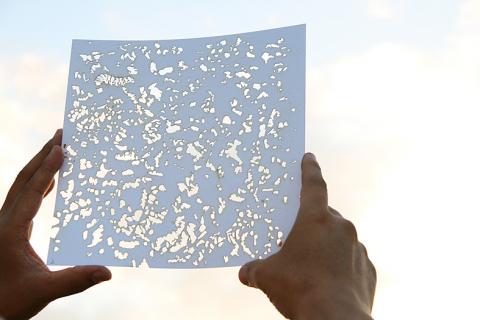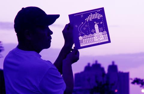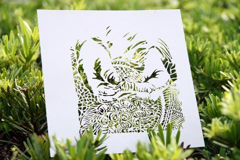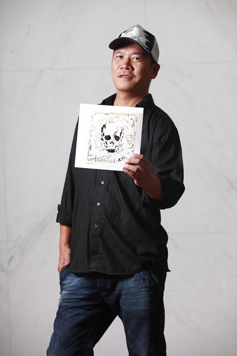 Some of the other images are dark and unsettling, while others are idealistic. Delicate plumes of smoke envelop a human skull and animal skeletons in one, while another is based on a photo of villagers fleeing from their homes during Typhoon Morakot. Another features a close-up of Amis Aboriginal singer Difang’s (郭英男) hands carefully wrapping betel nuts. Xiao’s inspiration came from life in Taiwan, but he says his artwork’s message is universal: Each person is a steward of the planet.