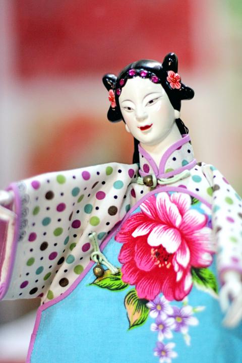 As soon as visitors walk into Changyifang’s combination studio-storefront, they are greeted with an explosion of colors: The company’s bags and accessories come in a rainbow of bright hues and lively patterns, including Taiwan floral cloth. Puppets are carefully arranged on shelves, with cards in English and Chinese explaining the characters’ backgrounds. Sheng (生) are male puppets of different ages, professions and temperaments, while female characters are called dan (旦). Others represent historical and literary characters, such as figures from The Romance of the Three Kingdoms.