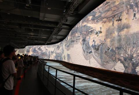 After debuting at the Expo 2010 Shanghai China (2010上海世界博覽會) and traveling to Hong Kong and Macau, an animated version of the Song Dynasty painting Along the River During the Qingming Festival (清明上河圖), by 12th-century artist Zhang Zeduan (張澤端), is on show in Taipei. The 25cm by 529cm original is a panoramic portrayal of everyday life in Bianjing (汴京), today’s Kaifeng (開封), the capital of China during the Song Dynasty. Despite its name, the scroll depicts the architecture and scenery of the period and the apparel and activities of the rich and poor, not the rituals of the Qingming Festival (清明節), otherwise known as Tomb Sweeping Festival. Thirty times larger than the original painting, the animated version, which is titled River of Wisdom, is beamed onto a 6m by 110m screen by 12 projectors. The entire work was digitalized by Crystal CG (水晶石數字科技公司) and its subjects and backdrops move and make sounds. There are two versions of the animation that alternate every two minutes: day (691 animated people) and night (377 animated people). Also on display are life-size replicas of the original painting, a Ming Dynasty copy by Qiu Ying (仇英), and a more extravagant 1736 version known as the Qingyuan copy (清院本), commissioned by the Qing court. The original work is stored at the Palace Museum in Beijing.