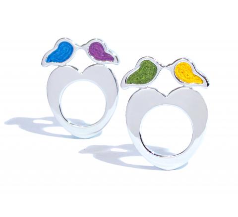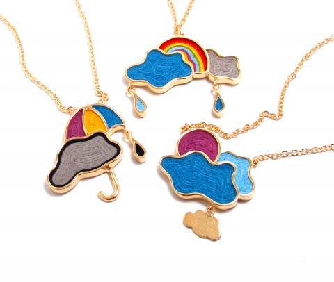 “When I wake up, I hear birds singing. When I open my studio window, I see birds or squirrels outside,” Chen says. Several of her designs are created in small collections that together tell a story. The pendants in Bulletin of Mood (心情告示榜), one of the company’s best-selling series, are meant to discreetly broadcast the wearer’s emotions with weather motifs. A multi-colored umbrella that can’t quite provide shelter from a large gray cumulus and raindrops stands for sadness, while a rainbow peeking from between two clouds represents a gradual recovery from depression. Finally, a purple sun emerging from clouds in shades of turquoise and sky blue symbolizes happiness and joy.