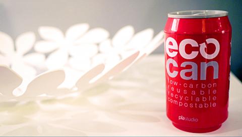 Shaped like an ordinary aluminum soda can, My ECO Can is actually a reusable beverage container made from poly-lactic acid (PLA), a biodegradable substance that feels like plastic but is derived from renewable resources like cornstarch. My ECO Can is produced by Taipei-based PLA Studio.