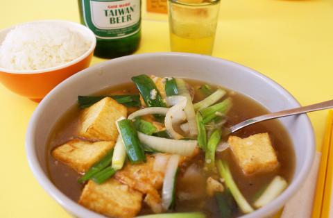 The explosive green onion, tofu and beef (NT$100) is a dish also worth ordering, both because of its tasty combination of ingredients as well as its light seasoning. But the green onion and tofu (NT$100) is the standout dish of the items that I tried. Large chunks of lightly seared tofu are drowned in a robust Cantonese-style stew. I’ve tried this dish at other restaurants, many charging double the price for similar sized portions, and this version wins hands down. It went well with a large bottle of Taiwan Gold Label beer (NT$80) and complimentary bowl of white rice.