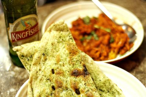 The curries I ate at Mayur Indian Kitchen are mildly spicy, but can be made more piquant based on customer requests. The restaurant offers several jain, or vegetarian dishes, such as aloo gobhi (NT$110), which is made with sauteed potato, cauliflower, tomato and spices. I liked how the cauliflower was lightly cooked to retain some of its crunch. The tandoori chicken masala (NT$145) was also good, though most of the chicken was still on the bone and it became tiresome picking off the meat. My favorite dish of the night was the chana masala (NT$95), which paired very well with the butter naan (NT$55). Mayur Indian Kitchen’s freshly prepared version of the Indian flatbread is especially good: the edges are baked until crisp, while the middle is moist and chewy — just right for scooping up curry. The naan comes in 14 savory or sweet flavors. My companion and I also ordered the garlic version (NT$55), which was topped with a plentiful sprinkling of seaweed flakes. The flavor combination was fine but unexpected. We preferred how the plain butter naan tasted with our other dishes.