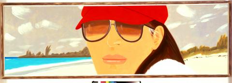 Katz favors bright, uniform planes, put together to make up faces and bodies, with just enough depth to keep up an illusion. Behind the people, and when there are no people, he offers solid lines, flat skies, landscapes that are almost abstractions, as in Matisse: Katz often seems to be thinking about Matisse, or else about other friendly modernist models for his not-quite-realist homage to how the world looks. (Katz’s memoir, Invented Symbols, says that “the only art book I had for twenty years” was a collection of pictures by Henri Rousseau.) The people themselves in Katz’s paintings can look almost flat too, like people on posters, in four-color printing, or in old comic books. They are almost cartoons, but not quite: not even the outsized Black Hat (Bettina) (2010), whose subject looks out from a wide hat and black sunglasses with scarlet lips in a slight smile, as if from an old cigarette ad.