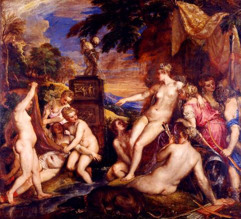 If Hale’s biography is a superb portrait of the artist — an example of measured scholarship, judicious opinion, and telling framing detail — it is the numinous and protean aspects of Titian on display at the National Gallery and Royal Opera House. The three paintings that inspired Metamorphosis are part of the series of pictures known as the “Poesie” — poems — painted for Philip II. Started in 1553 the paintings are studies in erotic passion and its effect on destiny and were designed to arouse the senses and flatter the erudition of his regal patron. The three in the National deal with the implacable goddess Diana; first when she curses the young hunter Actaeon when he stumbles across her bathing naked; second when she turns him into a stag and watches him torn to pieces by his own hounds; and third when she discovers that her handmaiden Callisto has become pregnant by Jupiter.