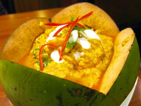 Thai Made’s lengthy, tri-lingual menu (Thai, Chinese and English) is daunting to look through at first, but the restaurant’s recommendations are delineated with small yellow dots — and servers are quick with recommendations. These include the excellent “traditional northern Thai original raw fish salad”(NT$280), which the restaurant prepares in limited quantities every day. It is made from a finely minced mixture of raw fish flavored with green onions, garlic, chili and spices until eye-wateringly piquant. The salad is served with a pile of crisp cabbage leaves to scoop the fish onto.