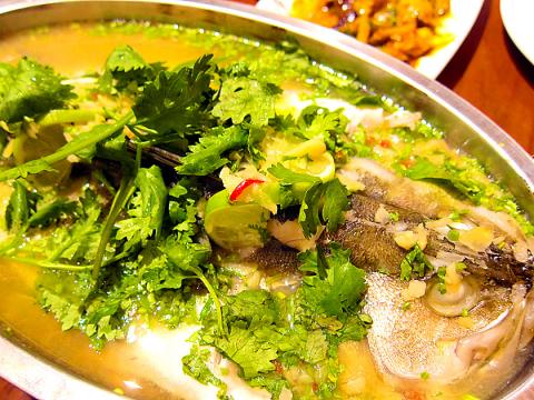 Both the raw fish salad and eggplant featured rich flavors and very spicy chili peppers, while the steamed sea bass with lime, garlic and chili (NT$400), another one of the restaurant’s signature dishes, came as a welcome mellow break for our taste buds. The fish, served whole, was cooked until its flesh was buttery and had picked up the flavors of the aromatic broth. Along with the raw fish salad, the steamed sea bass was one of our favorite dishes of the night.