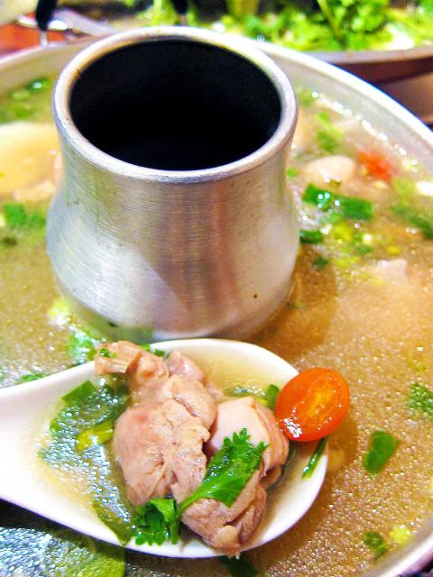 Northern style chicken in galangal soup (NT$300) was another refreshing dish ideal for a summer night. It featured chunks of boneless white chicken meat simmered until tender in a broth with lots of lemongrass, galangal (a root vegetable related to ginger), cilantro, cherry tomatoes and red chili peppers.