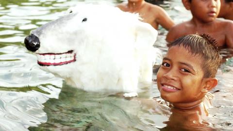 In Tuvalu, Huang set up an installation art piece on a beach that consisted of a fuel truck nozzle tied in a knot. The 4m by 2m artwork also featured an image of a polar bear relaxing in a hammock, symbolizing “the end of the world’s reliance on oil and a move back toward a life of simplicity,” he said.