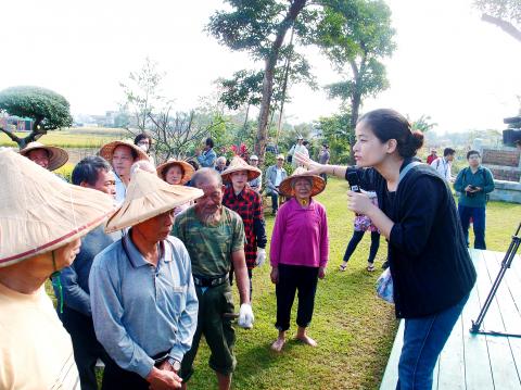 It was an unusual theatrical performance that took place on a recent Sunday in Erchongpu (二重埔), a Hakka farming village in Jhudong Township (竹東), Hsinchu County. A group of farmers , many in their 60s and 70s, tilled the land, planted seedlings and harvested in front of a large audience made up of activists, teachers, students and families as well as members from self-help organizations in Miaoli County’s Dapu Village (大埔), Puyu (璞玉) in Hsinchu County’s Jhubei Township (竹北) and other communities facing land expropriation by the government to make way for development projects.