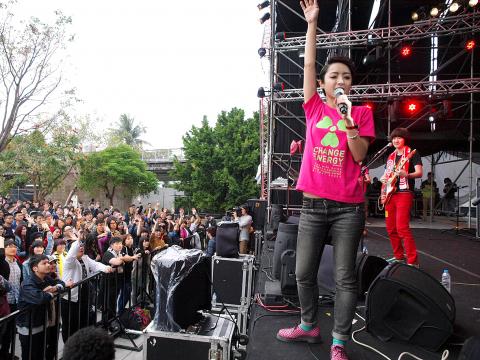 Anti-nuclear sentiment was ubiquitous. In addition to the stickers, t-shirts and shuffling environmentalist proselytizers, a slew of musicians took up the cause. Bobby Chen (陳昇) exhorted a big, main stage crowd, “Don’t be against nuclear power, get rid of it all together.” Wonfu (旺福), Dog G (大支) and Fire EX (滅火器) also bandied around the cause.