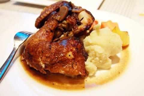 Hawaiians will be happy to see Loco Moco (NT$290) on the menu and not something with pineapple, for once. The traditional island fare is made from long grain rice and an Angus beef patty soaked in gravy. The sunny side up egg that topped off the dish made me feel as though I was eating breakfast for dinner. On to the meat and potatoes, the rosemary roasted half chicken with porcini sauce (NT$450) was so moist that the garlic mashed potatoes and seasonal vegetables were subsumed in the jus.