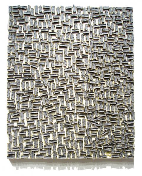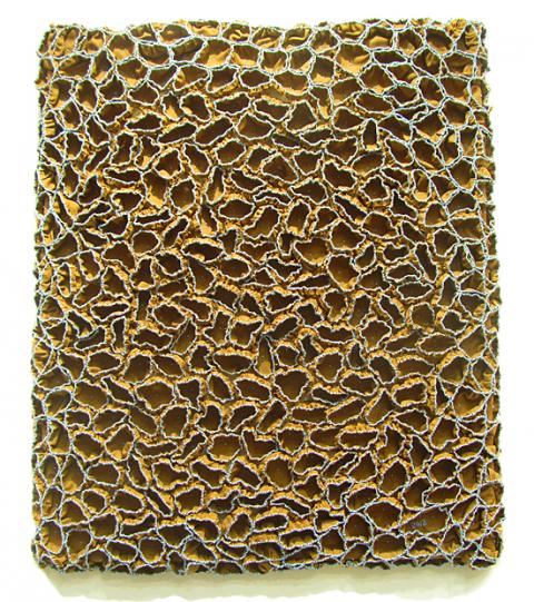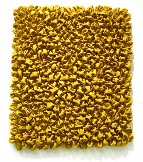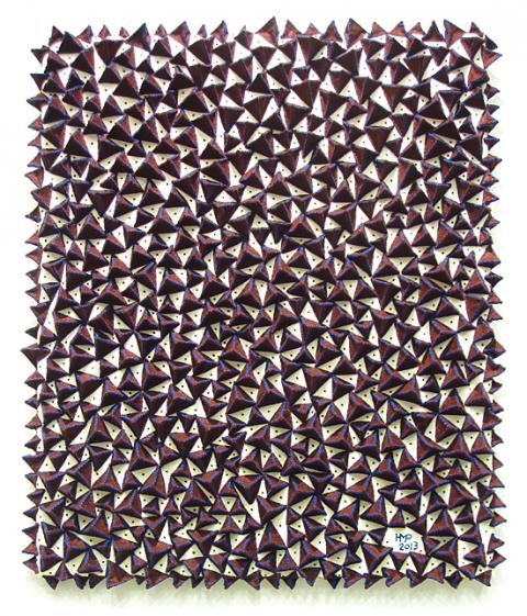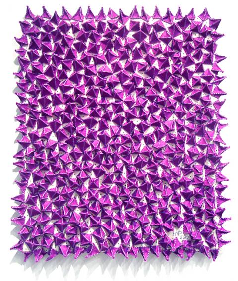 Though perhaps classifiable as paintings, the three-dimensional weaved shapes — pyramids, spheres, rods, discs — make them more akin to sculpture. The artist has said that her works were inspired by the environmental installations of Andy Goldsworthy and the monotone geometrical sculptures of Louise Nevelson.