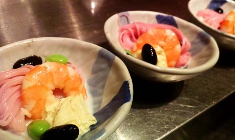 Another panel features creative dishes in a tiny cup, the ingredients of which look as though they were arranged with tweezers. Some, like the single scallop on miso wasabi sauce and greens, brightened with a triangle of red bell pepper, were tasty. Others were strange, like the bacon cake doused with mayonnaise and herbs. The texture took its cue from fresh rice cake, but had a powerful fleshy flavor that made it hard to chew.