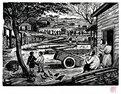 An Ode to Printmaking: A Retrospective (周瑛印紀) surveys the late printmaker Chou Ying (周瑛), who cofounded the Taiwan Society of Printmaking in 1970. Chou began his career with classic woodcut prints that rendered country folk in refined and realistic lines. After 1950, he branched out into other mediums such as cane-fiber boards, paper and finally stone. Chou’s Ode to Stone, a series on display at the Kuandu Museum of Fine Arts (KdMoFA, 關渡美術館), was created by an innovative rubbing — not carving — technique that makes the cold stones exude warmth and light on prints.