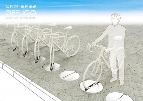 Three college seniors have created an innovative bike lock meant to provide more room on Taipei’s congested sidewalks. Offugo (公共自行車停車磚) is an aluminum alloy plate that fits like a manhole cover into the ground and works by pinning a tire to a retractable spine. It doesn’t look like much, but that’s the main attraction.