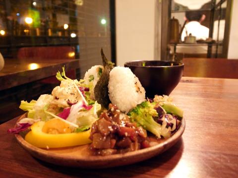 With two types of onigiri — salmon and cod roe — to choose from, the set includes two rice balls and a few side dishes. The common rice ball may not elicit much excitement, but Megane’s version is pepped up with various fragrant herbs, and is accompanied by pickles, egg salad, bell peppers, mushrooms and purple yams, the sweetness and fine texture of which took my taste buds by surprise.