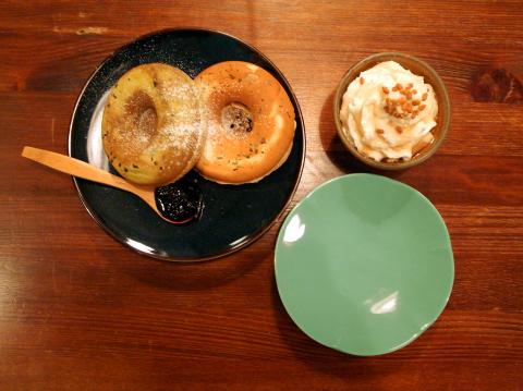 The dessert section includes maple syrup and jam waffles (NT$160 for two and NT$180 for three) and banana chocolate caramel waffles (NT$180 for two and NT$200 for three). Using waffle flour from Japan and fruit preserves by Bonne Maman of France, the waffles are baked with nuts and sesame seeds and shaped like a donut and served with a dollop of whipped cream.