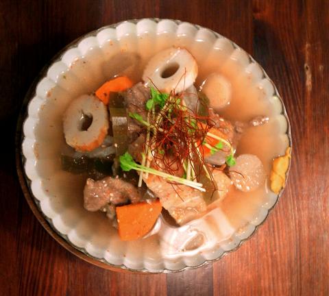 The chicken stew soothes the stomach in a light, simple way. It contains daikon (a Japanese white radish), carrots, fish cakes and a dab of yellow mustard that gives the broth a needed punch because overall the dish was quite bland.