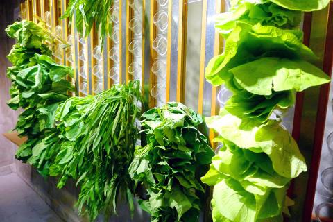 A stunning green wall of leafy vegetables lines the adjacent wall. It almost looks like a vertical garden, except that the vegetables are bundled and sit in plastic cylinders. Each row is a different type of plant, and on the day I visited there were eight to choose from. The labels are all in Chinese but I recognized sweet potato leaves, bok choy, water spinach, Chinese cabbage and rape. Each bundle costs NT$35.