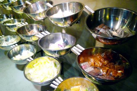 Along one wall, large metal bowls are fastened to the wall and in them sit uncooked and pre-packaged ingredients (NT$35 each). Vegetable options include, but are not limited to, carrots, green peppers, several varieties of mushroom, fermented and dried tofu, rice balls, fish balls, baby corn, okra, bamboo, green beans, cabbage, cucumbers, broccoli, seaweed, fungus and pumpkin.