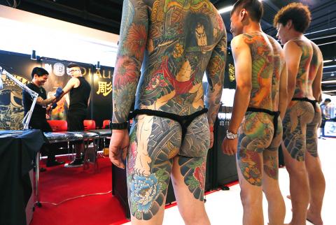Spectators were awestruck by the sight of four near-nude male models showcasing their colorful full-body tattoos in Japanese style.