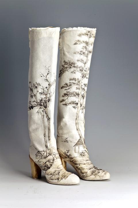 Letters from a Distance (遙遠的信件) is a solo exhibition of pop art by Beijing-based artist Peng Wei (彭薇). Peng uses classic Chinese painting techniques to create everyday wearables like boots and slippers. In a project that gives the exhibition its name, Peng paints notes and poems of Western writers onto hand-mounted scrolls and Chinese album leaves, and then incases the lavish letters in carved boxes.