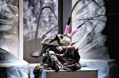 Wu said that imitating a woman and a bug are equally challenging. “As you know, the bug in Kafka’s book has nothing to do with any natural insect. It is a monster created by a human. After brainstorming with Lai Hsuen-wu (賴宣吾), we remodeled the Kao (靠) — a kind of armor in Beijing opera — to build the costume,” he added. Lai, as the show’s costume designer, planned several striking looks for Wu, including one that requires Wu to sing in a white and tight-fitting bodysuit with a face inked on his forehead.