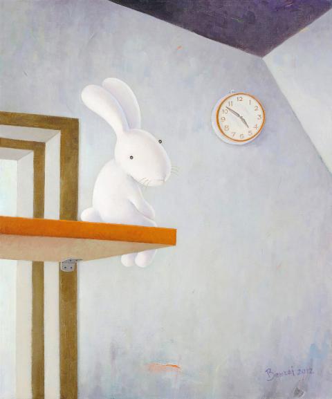 At solo show Dreams for Sale (夢想大拍賣), Benrei Huang (黃本蕊) presents acrylic paintings of a prominently whiskered rabbit named Nini (尼尼). Each work is a colorful picture-story featuring Nini in a familiar situation, be it scheming with dwarf rabbits in Partisanship (政黨生涯) or peering out wistfully by a clock in 9-5 Syndrome (上班族徵候群).