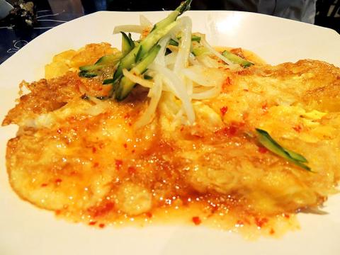 Neiwan Theater also serves most of the familiar Hakka dishes such as salted pork (客家鹹豬肉, NT$150), oiled chicken (客家油雞腿, NT$200) and prawns steamed in a bamboo case (竹筒蝦, NT$200). Classic Hakka ingredients — available to buy at the street market outside the theater — make repeat occurrences on the menu. There’s a lot of white ginger lily, a fragrant flower with a slight cinnamon aftertaste, and some funky preserved vegetables that make an appearance in eggs, soup and meats.