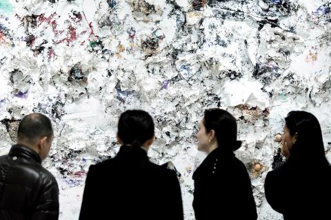 The large canvasses that make up his Recipe for a Painter show, which runs until March 8, incorporate materials including gold leaf and silver, household trash, acrylic paint, blow-torched metal and broken eggs in what one critic has described as a “fusion of the performative and the painterly.”