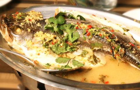 The Thai-style steamed sea bass with lemon sauce (NT$380) came served still broiling over a flame, the fish lavished with cilantro and swimming in a pool of lemon soup that gives the dish its zing. The fish is tender and fell apart before it even hit my mouth and I had to scoop it up with a spoon. This was a table favorite on both occasions.