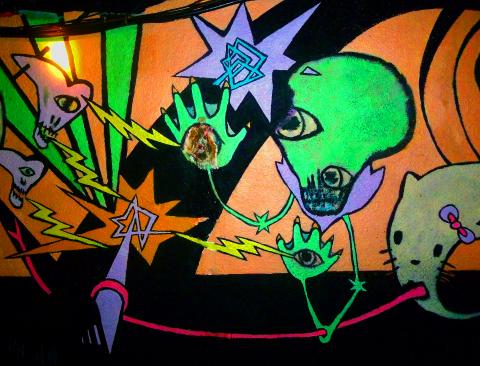 Taipei-based artist and musician Floaty (Keith Saunders) is as much a part of Underworld’s history as anyone. A 13-year resident of Taiwan, the Michigan native who counts among his influences everything from Mad magazine to Marc Chagall started hanging out at the former Shida Night Market area mainstay about a dozen years ago. Eventually he could be found manning the DJ booth a few days a week, spinning Slayer, the Ramones, the MC5. If it was real, Floaty played it. Then the owners asked him to do something about the bare walls.