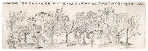 Forest Project (木林森) showcases sketches and paintings by Chinese artist Xu Bin and children from the Sandimen Township (三地門鄉), Pingtung County, which was devastated by Typhoon Morakot in 2009. As part of his international Forest Project, Xu opened an on-site course at the village last year to teach 6 to 12 year olds to paint trees. Later, he uploaded online course materials for local teachers to use with their students, who have submitted over 1,400 paintings to the project so far. After the show, selected works will go up for auction, with proceeds headed to Sandimen Township for tree restoration.