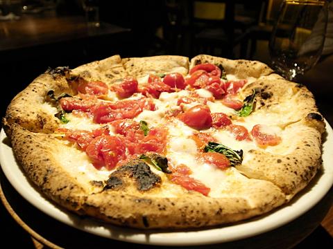 Then comes the evening highlight: D.O.C (NT$700), Cuomo’s rendition of Neapolitan pizza that won top award at the Pizzafest, a world pizza championship held in Naples. With simple offerings of cherry tomato, basil and buffalo mozzarella, the pie makes simplicity tasteful, with the thin crust baked to a slightly crispy brown on the rim, while maintaining a satisfyingly buttery and chewy texture toward the center. But if diners don’t dive into the pizza right away, the crust tends to get soggy and can barely hold the toppings.
