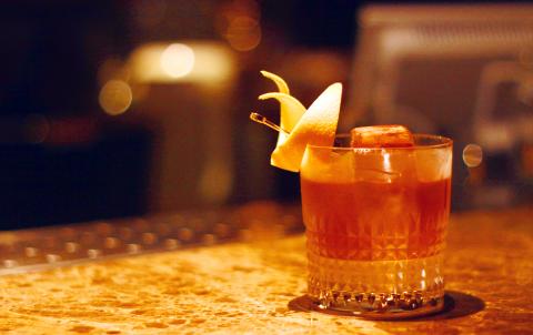 Step through a secret door that doubles as a bookcase into the prohibition era at Alchemy. The quintessential dark wood and leather accenting has created a 1920s haven for nostalgic liquor lovers who enjoy a touch of jazz while sipping on an Old Fashioned (NT$450). The drink can be ordered off the vintage menu and is also what owner Angus Zou (鄒斯傑) recommends, despite Alchemy’s extensive selection of cocktails. He says it possesses the four elements that are dear to a cocktail — sugar, water, spirits and bitters. Bourbon, sugar cane and bitters are served elegantly in a Waterford-style crystal tumbler and the drink is redolent of Christmas thanks to a twist of orange rind.