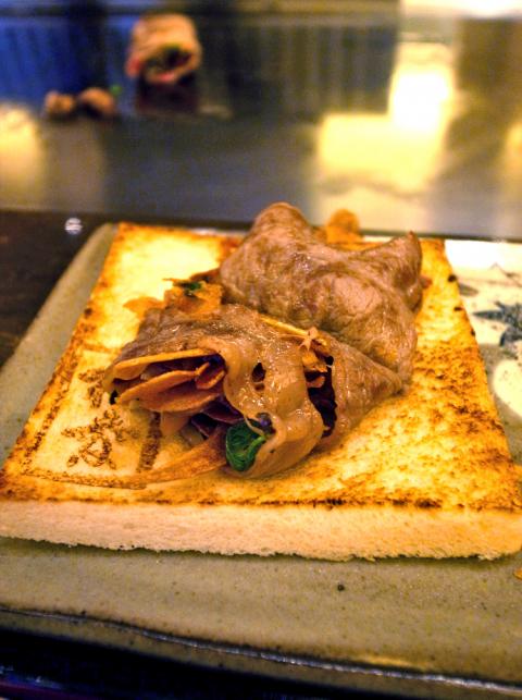 As I was still marveling at the fish, my USDA prime sliced sirloin (NT$1,700 for a set) was presented. Reportedly Hong Kong pop star Sammi Cheng’s (鄭秀文) favorite food at Matsubishi, the beef rolls definitely lived up to their name. Cooked medium rare, the thin slices of buttery meat were wrapped with garlic crisps and finely chopped scallions, and together, they made a divine combo.