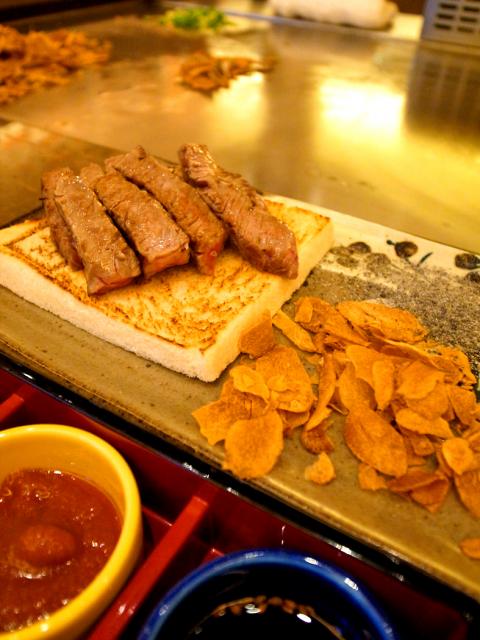 Located three-minutes by foot from the Nanjing East Road MRT Station (南京東路捷運站), the two-story establishment stands out with an aura of sophistication and style beside the boisterous Hooters. A small, quiet front yard and outdoor seating sets the tone as patrons make their way into the restaurant, walk pass a glassy cellar sporting an extensive wine collection and up to the high-ceiling, delightfully spacious dining area on the second floor. The posh, U-shaped counter, which can accommodate 20 diners, is the rooms’ centerpiece, where the teppanyaki chefs, impeccably attired in black, show off their eye-dazzling skills on the iron griddle. There are also several box seats for those looking for privacy.