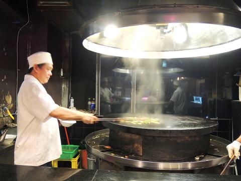 Finally, I handed my bowl to one of the two chefs at the semi-open kitchen next to the sauce counter. The chef skillfully stirred all the ingredients on the griddle and added some water to ease cooking. The sizzling sound and tempting smell immediately aroused my appetite. The chef said that the temperature of the griddle could be as high as 800 degrees Celsius, so they moved fast during the cooking process.